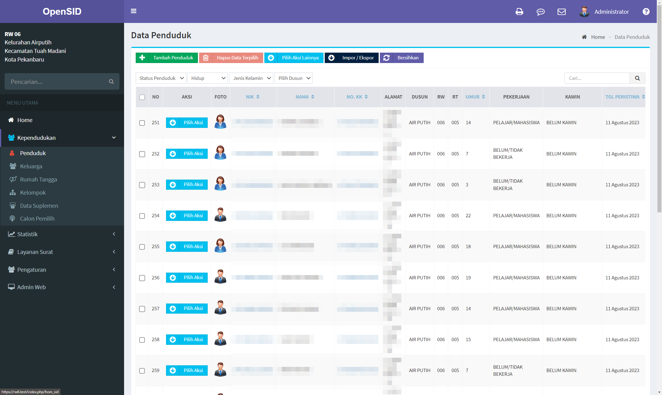 Sistem Informasi (SI) telah menjadi alat penting dalam mendukung pengelolaan dan pelayanan di tingkat komunitas. Dalam konteks RW 06, Kelurahan Air Putih, Pekanbaru, Riau, kebutuhan akan sistem yang efisien dan efektif semakin mendesak. Oleh karena itu, melalui program Kuliah Kerja Nyata (KKN) UMRI Smart, mengadopsi dan menyesuaikan OpenSID untuk memenuhi kebutuhan RW 06, khususnya RT 01 hingga RT 06. Tujuan utamanya adalah untuk memodernisasi administrasi dan meningkatkan layanan informasi bagi warga. Dengan menggabungkan teknologi dan pendekatan partisipatif, diberharap dapat menciptakan lingkungan yang lebih terinformasi dan terkoneksi. Penyesuaian yang dilakukan tidak hanya pada aspek teknis, tetapi juga pada konten dan cara penyajian informasi, sehingga relevan dengan konteks RW dan RT di Kelurahan Air Putih. Hasil kegiatan menunjukkan bahwa OpenSID berhasil meningkatkan efisiensi administrasi di RW 06 dengan mempermudah akses informasi dan pengelolaan data penduduk. Pelatihan yang dilaksanakan berhasil meningkatkan pemahaman dan keterampilan pengguna dalam operasional sistem. Survei yang dilakukan terhadap 6 RT menunjukkan respon positif dengan rata-rata 60% responden merasa mudah berinteraksi dengan antarmuka sistem, sementara hanya sekitar 16.67% yang tidak merasa demikian, dan 23.33% berada di posisi netral. Khususnya, materi pelatihan dinilai membantu oleh sebagian besar responden, dengan tingkat kepuasan yang tinggi terhadap kinerja dan fungsi sistem. Meskipun demikian, terdapat beberapa tantangan, seperti adaptasi pengguna terhadap teknologi baru yang terlihat dari persentase yang merasa 'Sedang' dalam beberapa aspek, dan kebutuhan pengembangan fitur tambahan untuk meningkatkan kenyamanan pengguna. Kegiatan ini memberikan wawasan tentang manfaat dan tantangan dalam implementasi OpenSID di tingkat RW, serta menyoroti pentingnya pelatihan dan dukungan berkelanjutan untuk keberhasilan transformasi digital di komunitas lokal