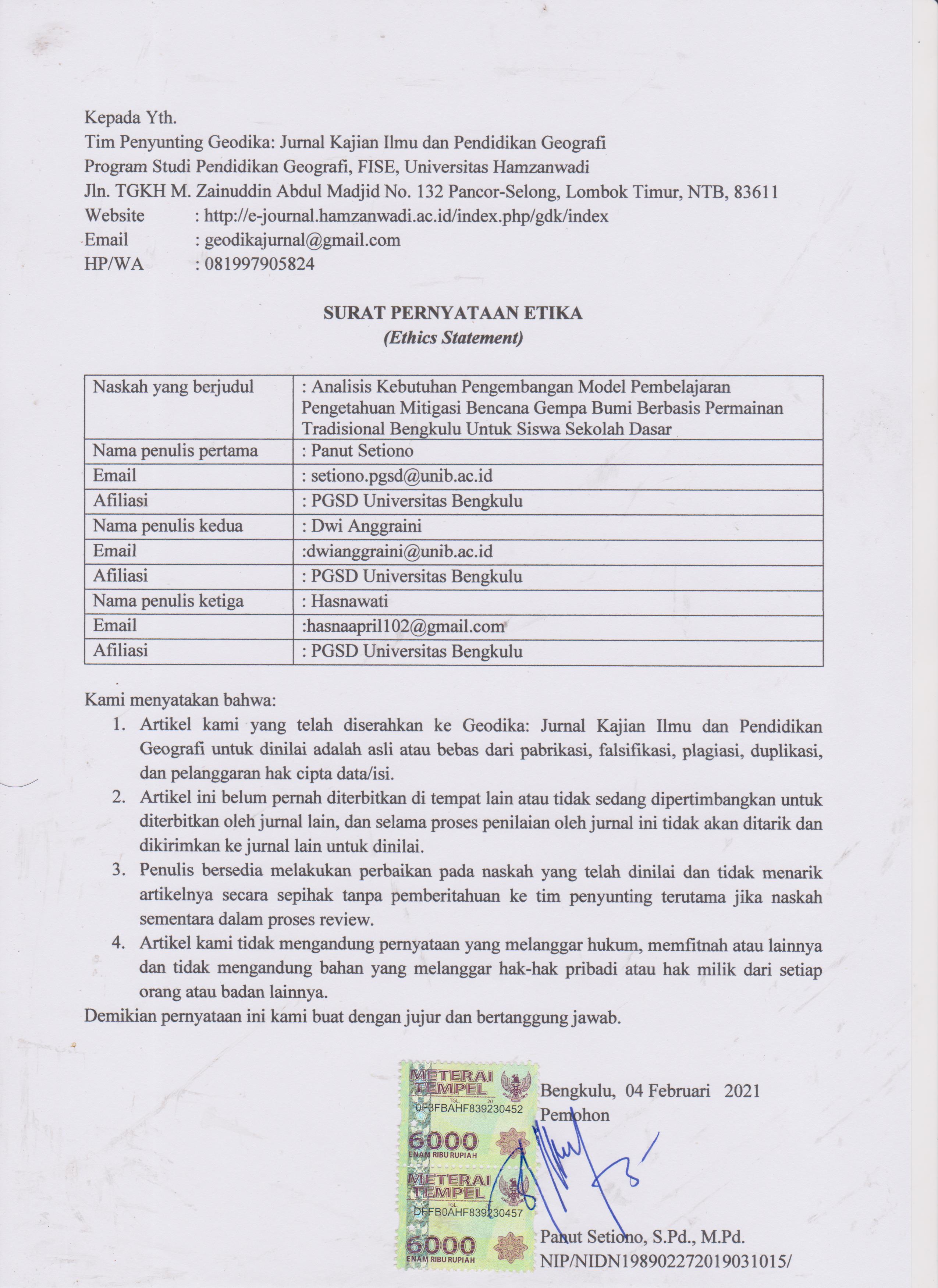 Pengetahuan mitigasi bencana gempabumi penting dikuasai oleh peserta didik usia sekolah dasar, tujuannya untuk memiminalisir dampak fisik dan psikis ketika gempabumi terjadi. Tujuan dalam penelitian ini adalah untuk mengetahui kebutuhan pengembangan model pembelajaran pengetahuan mitigasi bencana gempa bumi berbasis permainan tradisional Bengkulu. Analisis kebutuhan dalam penelitian ini merupakan bagian proses penelitian dan pengembangan (R&D) model ADDIE. Analisis kebutuhan dalam penelitian ini dilakukan berdasarkan analisis kurikulum dan analisis karakteristik siswa sebagai pengguna. Pengecekan keabsahan data penelitian dilakukan dengan diskusi teman sejawat. Hasil penelitian yang diperoleh dalam penelitian ini adalah model pembelajaran pengetahuan mitigasi bencana gempabumi berbasis permainan tradisional Bengkulu dapat dilaksanakan di Kelas IV Sekolah Dasar. Tema pembelajaran yang dapat digunakan yaitu Tema Daerah Tempat Tinggalku. Materi pokok yang ditetapkan yaitu: 1) gotong royong, 2) gerak dasar lari, 3) menjaga kelestarian alam, 4) sikap peduli lingkungan, 5) sikap disiplin menjaga kelestarian lingkungan, 6) Membedakan pengetahuan mitigasi bencana masa lampau dan masa sekarang, dan 7) Membuat diagram batang. Hasil analisis kurikulum menunjukkan bahwa model pembelajaran pengetahuan mitigasi bencana gempabumi untuk siswa sekolah dasar dapat dikembangkan.References